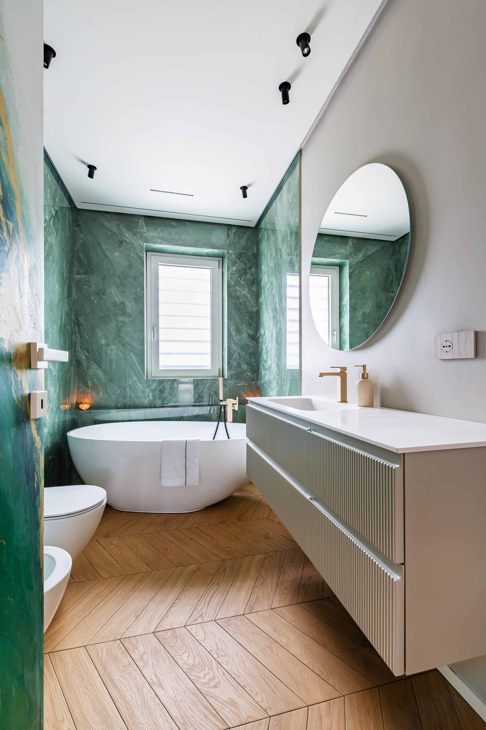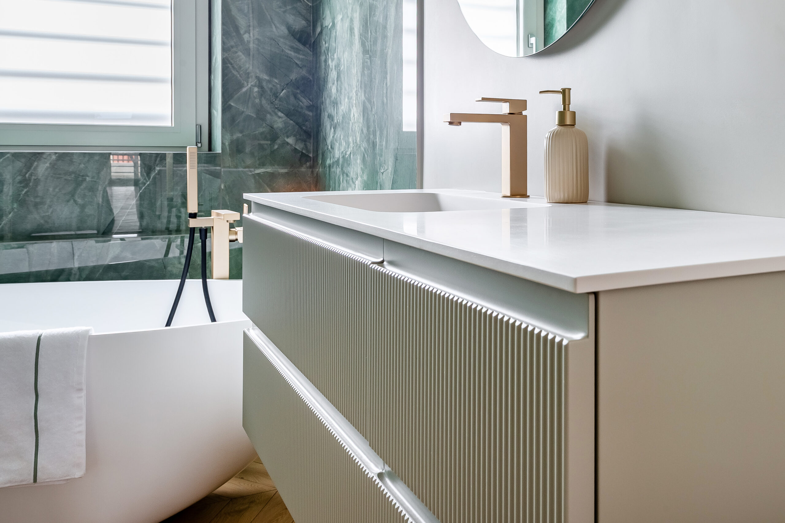 Al centro della stanza si impone una vasca freestanding, richiesta dalla cliente, dalle linee morbide e scultoree, pensata come elemento iconico e fulcro visivo dell’ambiente.