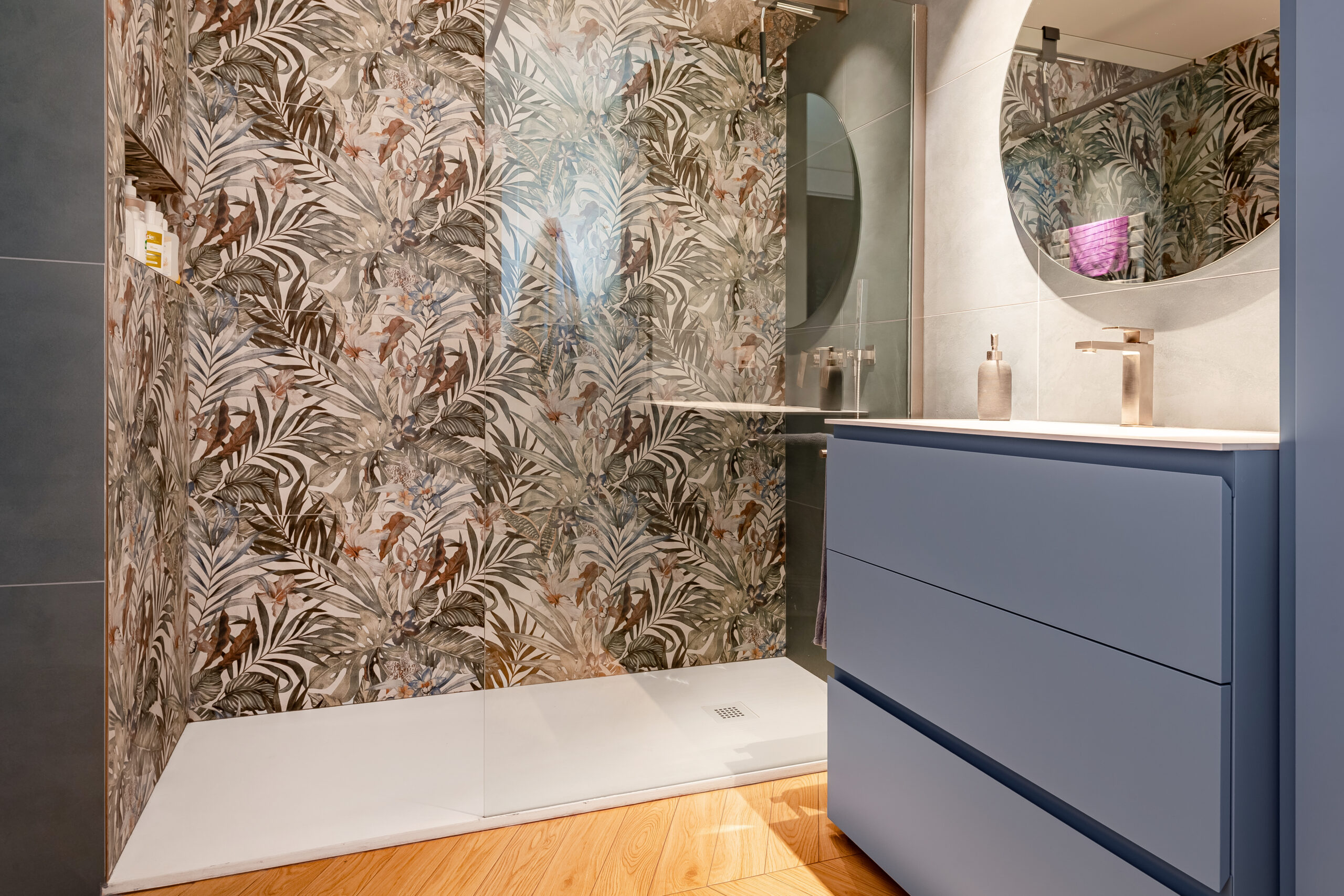 Il bagno si trasforma in un ambiente esclusivo e scenografico grazie al sapiente utilizzo dei marmi e delle piastrelle decorative effetto carta da parati, dove i colori diventano i protagonisti assoluti.