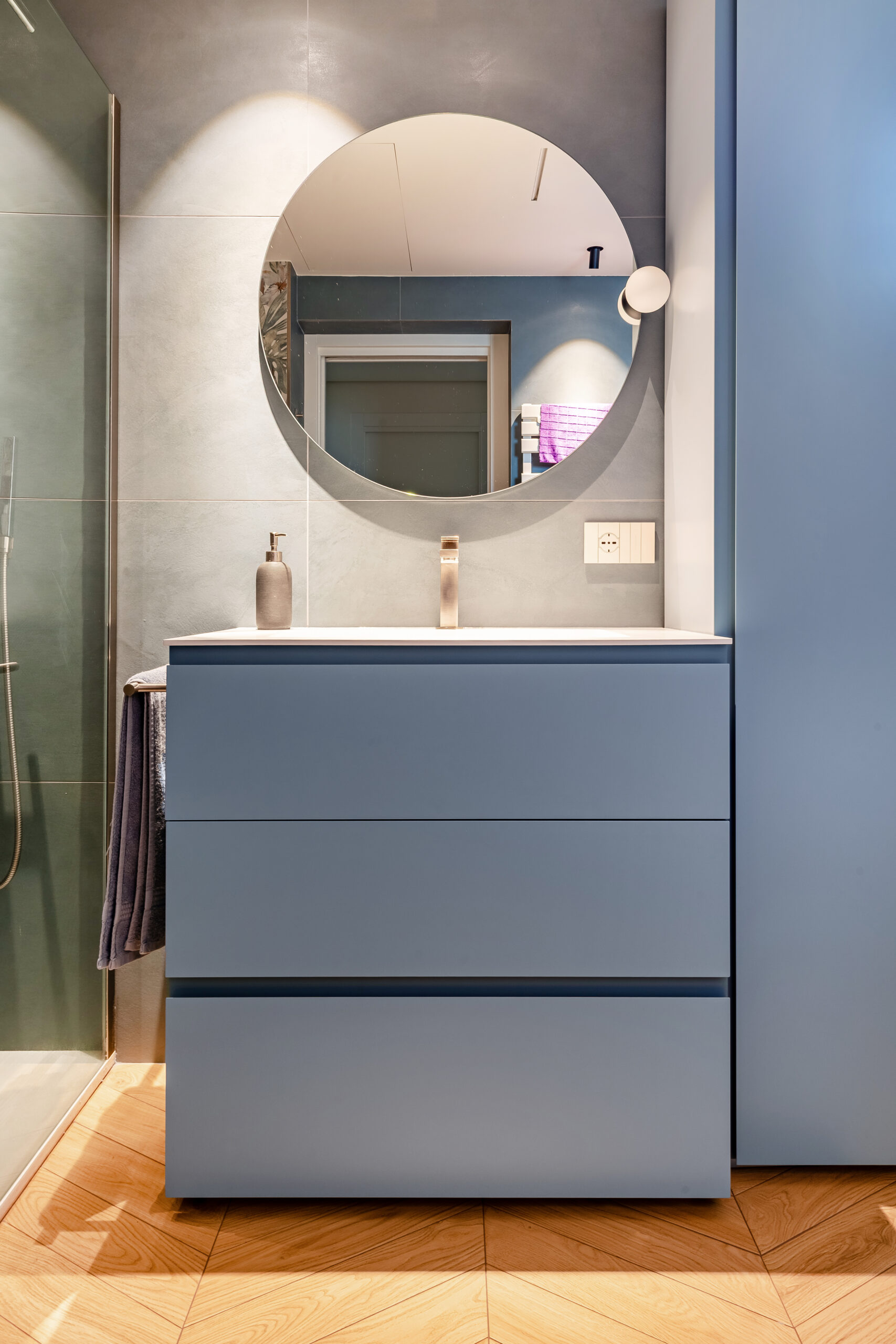 Il legno, un gres porcellanato che simula il rovere naturale a spina francese, è il protagonista delle superfici orizzontali, scalda l’atmosfera e contribuisce a creare un dialogo continuo tra estetica e comfort.